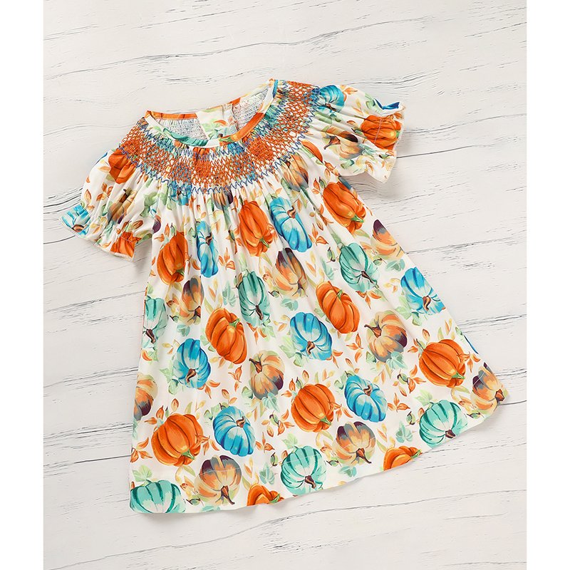 Toddler Girl’s Pumpkin Smocked Dress – Fall & Thanksgiving Princess Party Dress